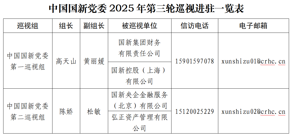 按照中國國新黨委和巡視工作領(lǐng)導(dǎo)小組部署安排,截至9月22日,中國國新黨委第三輪巡視完成進駐工作。中國國新黨委2個巡視組將對國新集團財務(wù)有限責(zé)任公司、國新央企金融服務(wù)(北京)有限公司、國新控股(上海)有限公司、弘正資產(chǎn)管理有限公司等4家企業(yè)黨支部開展常規(guī)巡視。