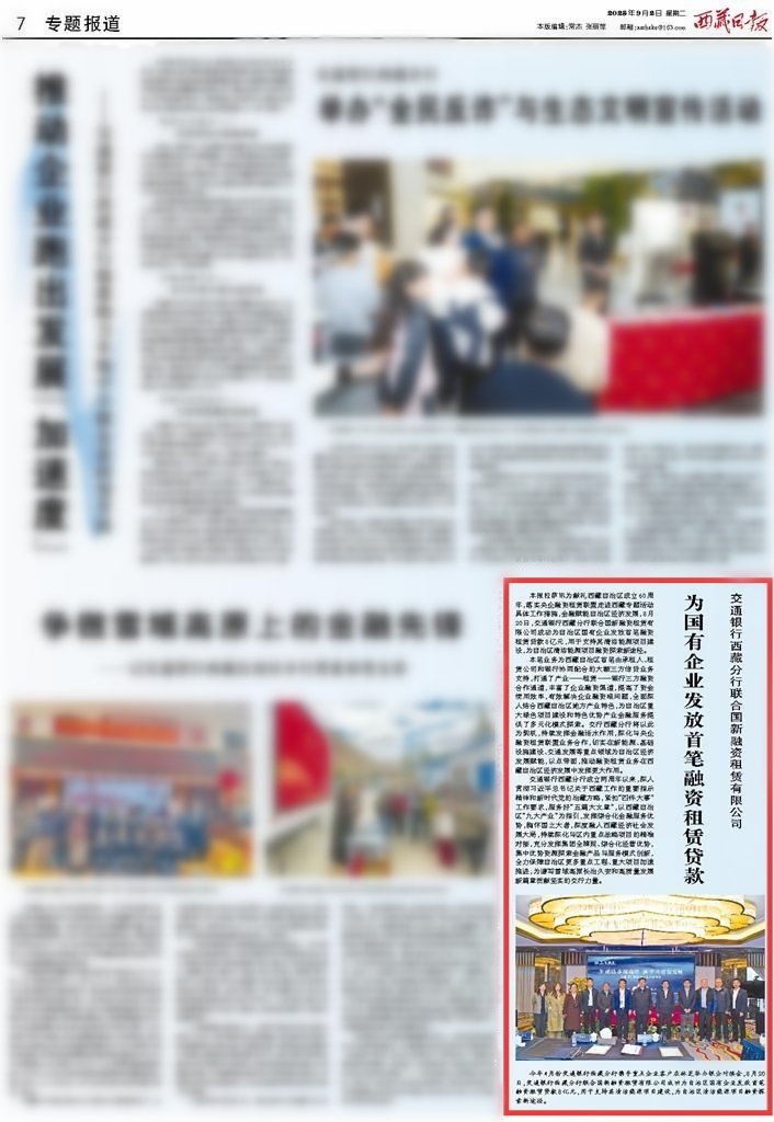 9月2日,西藏日報刊發(fā)《交通銀行西藏分行聯(lián)合國新融資租賃有限公司?為國有企業(yè)發(fā)放首筆融資租賃貸款》一文,聚焦國新租賃聯(lián)合交通銀行成功為西藏國有企業(yè)發(fā)放首筆融資租賃貸款8億元,有效解決企業(yè)融資難問題,推動融資租賃業(yè)務(wù)在西藏經(jīng)濟(jì)發(fā)展中發(fā)揮更大作用?,F(xiàn)將全文分享如下: