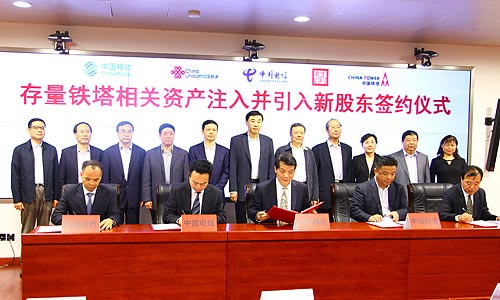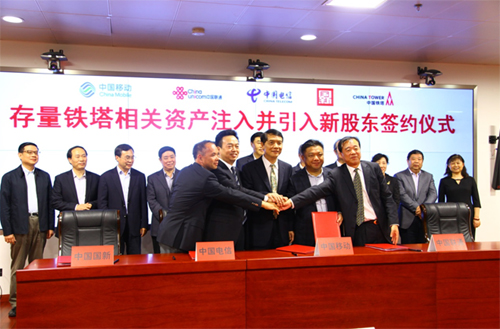 10月14日,中國國新與中國鐵塔股份有限公司(以下簡稱中國鐵塔)以及中國移動、中國聯(lián)通、中國電信三家基礎電信企業(yè)(以下簡稱三家電信企業(yè))簽署交易協(xié)議,中國國新以現金認購中國鐵塔增發(fā)股份;同時,中國鐵塔以增發(fā)股份與支付現金相結合的方式向三家電信企業(yè)收購存量鐵塔相關資產。交易完成后,中國國新持有中國鐵塔6%的股份,中國移動、中國聯(lián)通、中國電信分別持有中國鐵塔38%、 28.1%和27.9%的股份。