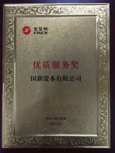 國新資本有限公司(以下簡稱國新資本)產(chǎn)權(quán)經(jīng)紀(jì)服務(wù)得到了北交所及所服務(wù)客戶的高度認(rèn)可,獲得北京產(chǎn)權(quán)交易所(以下簡稱北交所)2017年度優(yōu)質(zhì)服務(wù)獎。